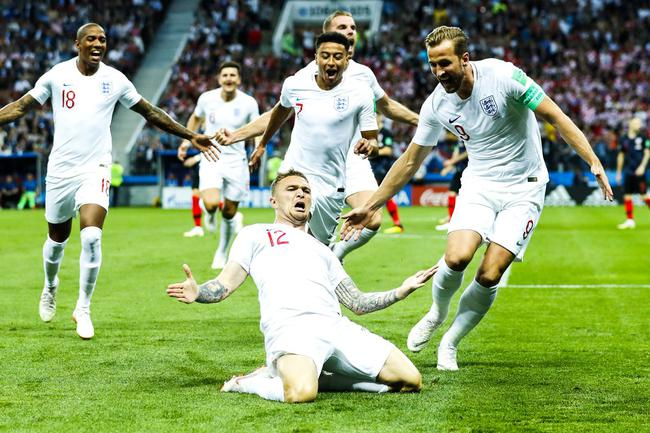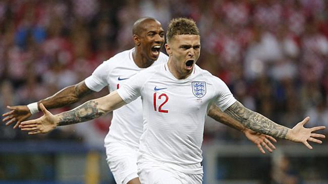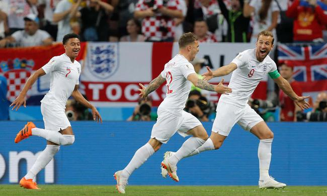 英格兰身着白色球衣。开场284秒,英格兰首次射门就取得领先!摩德里奇背后绊倒阿里,特里皮尔禁区弧顶主罚任意球越过人墙挂右上角,1比0。这是他12场国家队比赛处子球,也是他2016年2月热刺对沃特福德以来首粒正式比赛进球,成为首位世界杯半决赛进球的英格兰后卫。本届世界杯英格兰打进12球,超过1966年11球,创造本队单届世界杯进球纪录。英格兰还创下本队单届世界杯进球人数纪录(6人)。
