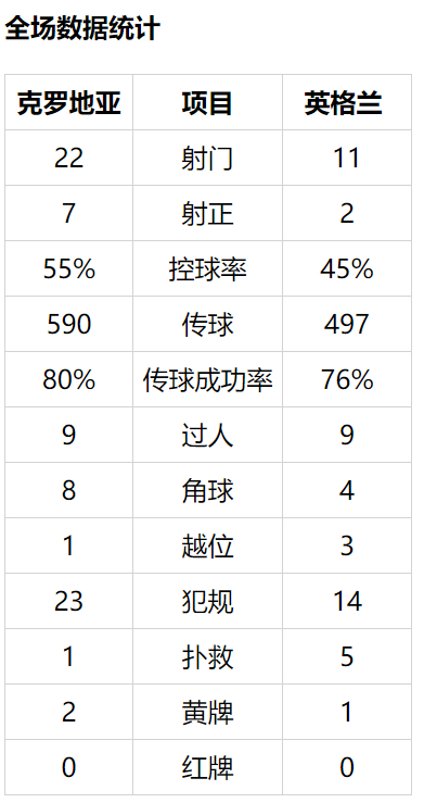 上半时两队各有1次射正。下半时,皮克福德开大脚,凯恩头球摆渡,斯特林回做,林加德禁区弧顶射门被洛夫伦挡出横梁。摩德里奇右路传中被斯通斯顶出,佩里希奇停球距门14米处补射被沃克封堵。特里皮尔传球,凯恩禁区右侧胸部停球接近零角度打中边网。
