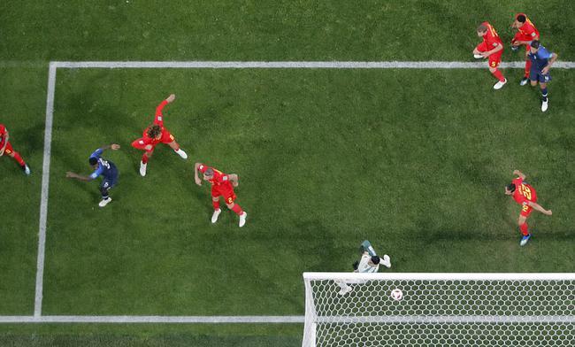 上半时两队共3次射正均被门将化解。近12场世界杯半决赛,有3场上半时踢成0比0。吉鲁成为本届世界杯唯一射门达到两位数却没能打正的球员(截止中场休息时已出场425分钟)。下半时,维特塞尔右路弧线球斜传,卢卡库在瓦拉内紧盯下距门8米处顶高。