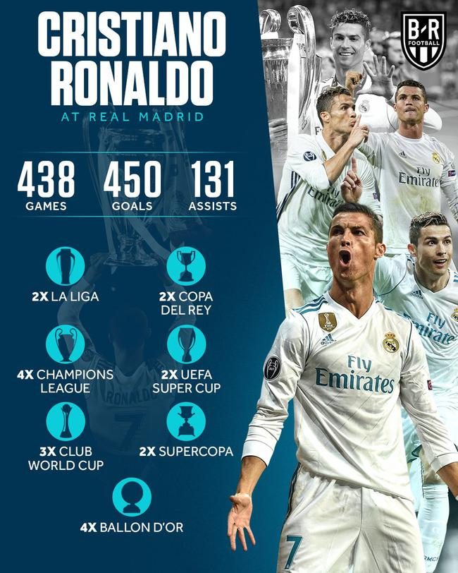 从2009年7月6日加盟皇马到今天宣布离开,C罗总共在皇马待了整整9个赛季,在这9个赛季的时间里,他总共为皇马出战了438场比赛,打进了450粒进球,帮助球队赢得了4座欧冠在内的16座冠军奖杯。